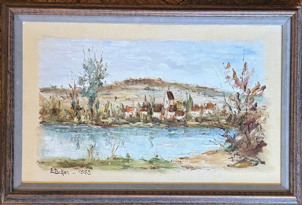 Discover a captivating piece of French art history with this exquisite oil on canvas painting by renowned artist Etienne Bellan (1922-2000). Created in 1983, this enchanting landscape captures the tranquil beauty of a rural French riverside village, likely set in a picturesque region like Brittany. Measuring approximately 18.5 x 27.5 inches (based on the frame’s visible size), the painting features a calm river reflecting the soft blue sky and surrounding scenery. On the opposite bank, a cluster of small houses with reddish-brown roofs nestles among gently rolling hills, framed by leafless trees with delicate, golden-brown foliage, suggesting an autumn or early winter day. Bellan’s signature textured brushstrokes and rich, earthy palette, blending shades of brown, yellow, green, and blue, evoke a peaceful, impressionistic mood, characteristic of his celebrated style.
