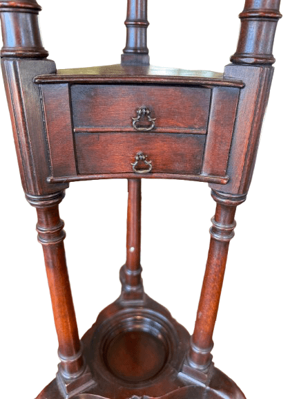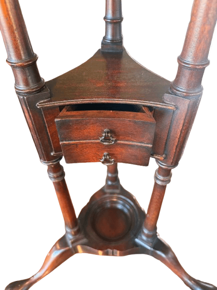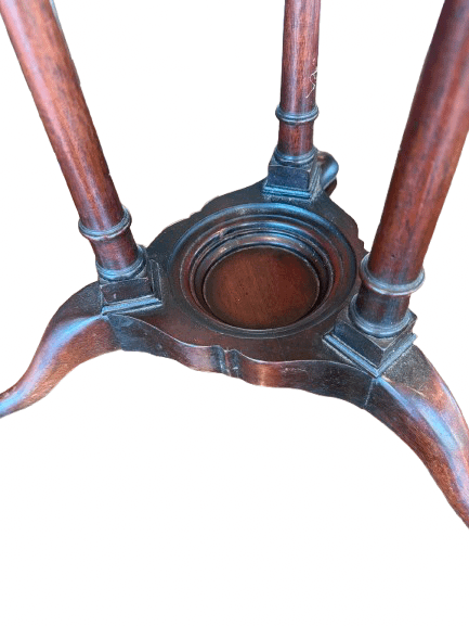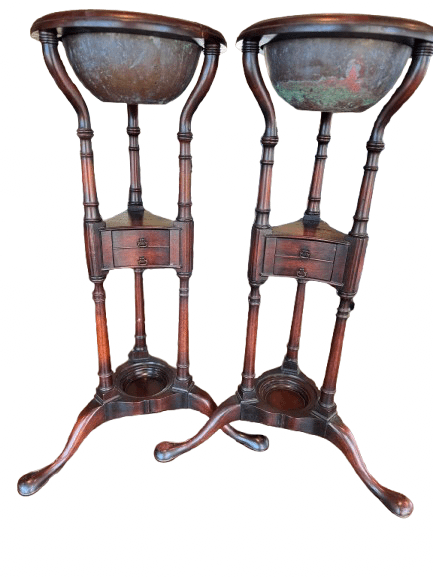 - Ornate Mahogany Construction: The stands showcase beautifully turned columns, fluted detailing, and gracefully curved cabriole legs, characteristic of the Neoclassical design popular in Georgian and Regency England or America. The wood’s deep reddish-brown hue is complemented by a smooth finish, revealing the natural grain and age.