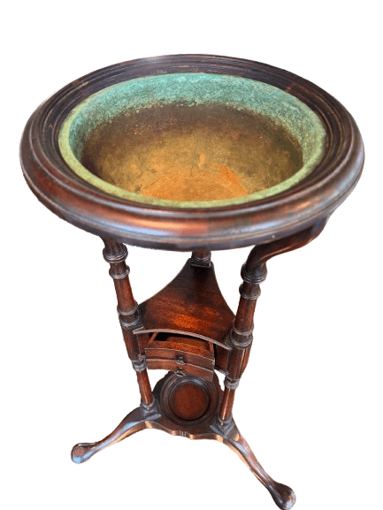 Standing 32 inches tall, this pair is in good antique condition, with signs of age and use that only enhance their charm. Minor wear to the wood and natural patina on the brass bowls tell the story of their history. These stands could have served as plant stands, washstands, or decorative pedestals in a formal parlor, entryway, or conservatory, reflecting the refined tastes of the Georgian or Regency elite.