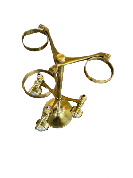Own a rugged and no-nonsense set of three non-drip drink dispensers, also known as optics. This is the ultimate statement piece for any bar enthusiast who appreciates vintage swagger with an industrial edge. Crafted from polished brass with a warm patina, this mid-20th-century masterpiece stands approximately 22 inches high. The sturdy flared base, measuring 8 inches deep and 10 inches wide, ensures rock-solid stability. Three angular arms extend from the central column, each fitted with a precision-engineered, non-drip pouring mechanism featuring stamped “Optic Pearl” brass valves, glass reservoirs, and original cork stoppers. Even with some wear, the bold, technical design and intricate brasswork exude character.
