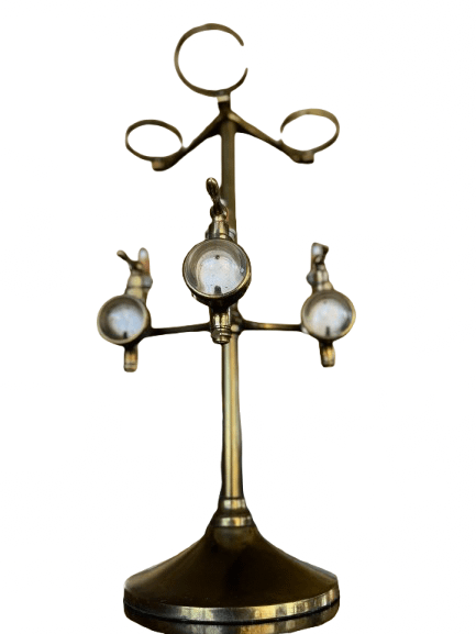 Own a rugged and no-nonsense set of three non-drip drink dispensers, also known as optics. This is the ultimate statement piece for any bar enthusiast who appreciates vintage swagger with an industrial edge. Crafted from polished brass with a warm patina, this mid-20th-century masterpiece stands approximately 22 inches high. The sturdy flared base, measuring 8 inches deep and 10 inches wide, ensures rock-solid stability. Three angular arms extend from the central column, each fitted with a precision-engineered, non-drip pouring mechanism featuring stamped “Optic Pearl” brass valves, glass reservoirs, and original cork stoppers. Even with some wear, the bold, technical design and intricate brasswork exude character.
